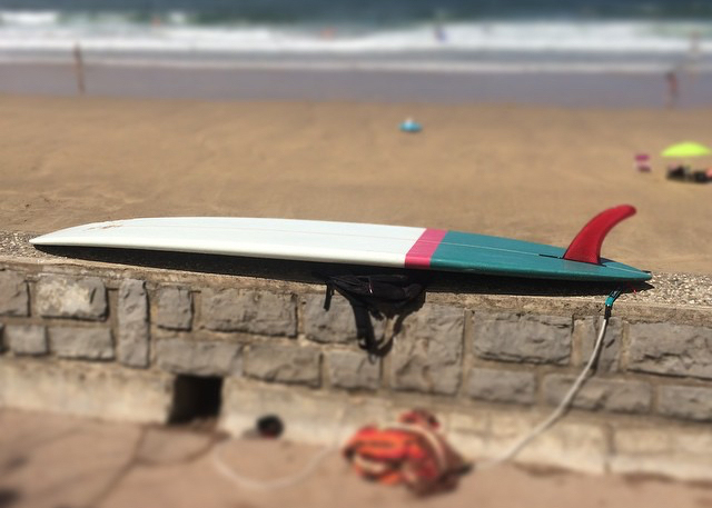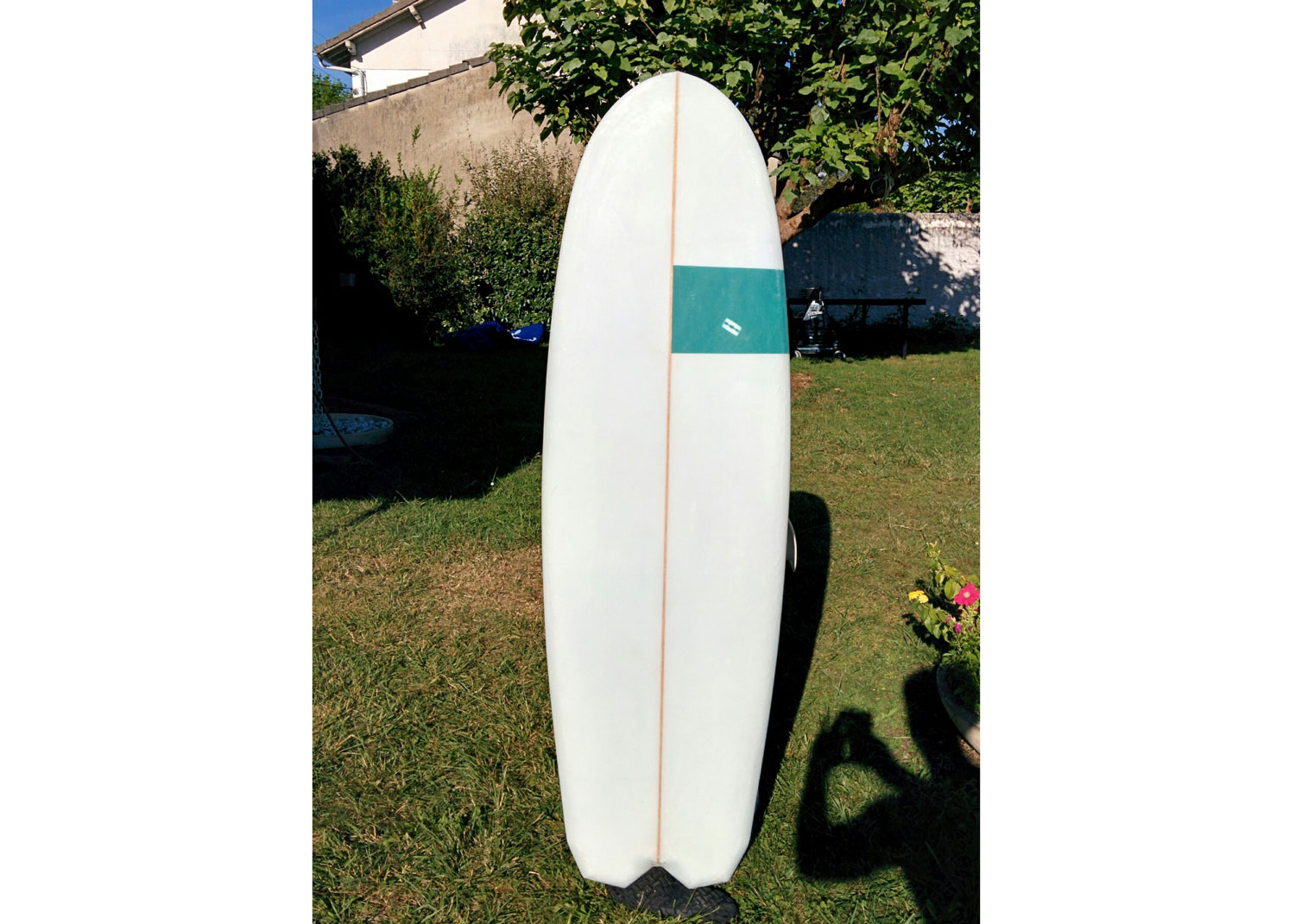 Handshaped longboard, 9'3 x 22"3/4, 3"1/4, flat to vee bottom, PU foam blank, polyester resin.