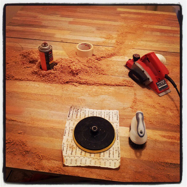Yes, there is planer on the pick, but ended up not using it cause the amount of dust it was making was just not possible inside my flat, and because it's my planer for shaping surfboards I wanted to keep the blade sharp.I covered the whole thing with cheap oil from IKEA, and it was done!