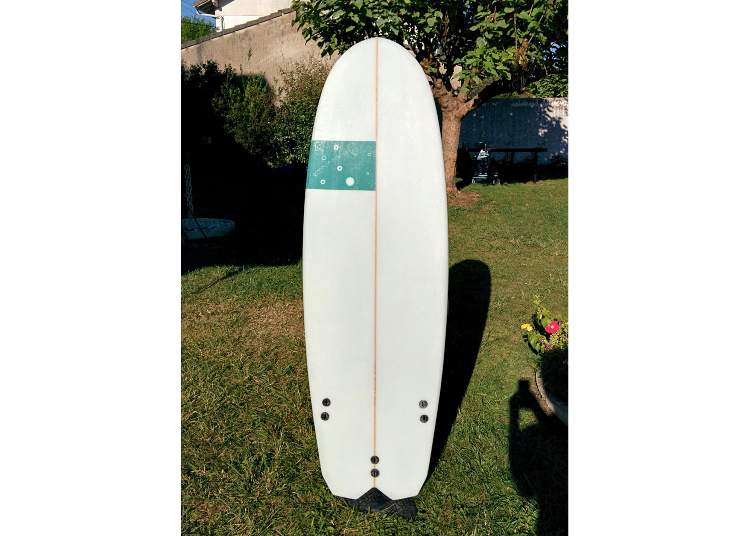 Going with a thruster setup here might not have been the best choice. Considering the width of the tail, a quad fin setup would have been way better, or a 5 fins setup, but it is still fine. Made an old-school leash loop, in fiberglass and resin, and I really like the way it came out.